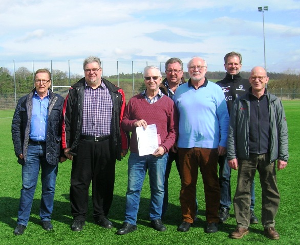 v.l. Matthias Schwing (lsbh Sportstättenberatung), Michael Hoyer (Sportkreis Öffentlichkeitsarbeit), Manfred Schmidt (Sportkreisvorsitzender), Joachim Sager (Kassierer), Wolfgang Bingel (1. Vorsitzender), Stefan Schmidt (Fußball-Abteilungsleiter), Thomas Nobbe (2. Vorsitzender) alle TGSV. Foto: Michael Hoyer