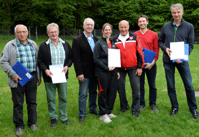 Der Sportkreisvorsitzende Manfred Schmidt (3.v.l.) und übergab die Bewilligungsbescheide an (v.l.) Karl-Heinz-Enders, Helmut Radmacher (beide GSV Born), Sonya Henneberg, Hans Körner, Felix Stöber (alle SGO Orlen) und Bernd Alberti (TTC Wallbach). Foto: Michael Reitz