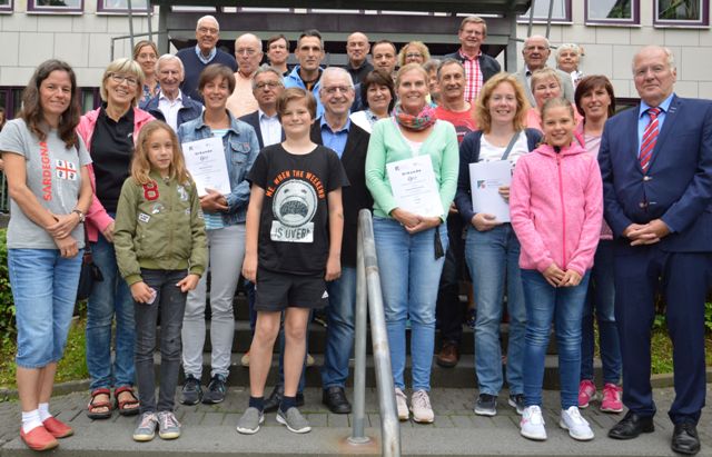 Die erfolgreichen Absolventen des Sportabzeichen-Wettbewerbes 2017 mit Sportdezernent Hans Rodius (rechts) und Sportkreis-Chef Manfred Schmidt (Mitte). Foto: Sportkreis