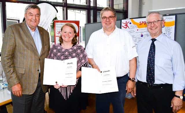 Rheingau-Taunus-Kreis – (MRM) Im Rahmen des Sportkreistages zeichneten der Präsident des Landessportbundes Hessen (lsb h) Dr. Rolf Müller und der Vorsitzende des Sportkreises Rheingau-Taunus Manfred Schmidt Christina Fuchs und Michael Hoyer mit der Bronzenen Ehrennadel des lsb h aus.