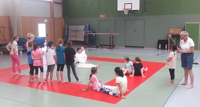 Anschließend gingen die Klassen geschlossen an die ihnen zugeteilten Stationen. Jede Einheit ging eine halbe Stunde, in der die Kinder in verschiedenste Sportarten einen Einblick in das Training erhielten. Nach der halben Stunde wurde zur nächsten Station gewechselt, insgesamt hatte jedes Kind und jede Klasse so die Möglichkeit in fünf sehr unterschiedliche Sportarten zu schnuppern. Neben den klassischen Sportarten wie Fußball, Handball, Basketball und Leichtathletik wurde auch die Möglichkeit geboten in eher unbekannte Sportarten "hineinzuschnuppern". So wurde neben Gerätturnen, Badminton, Tennis, Showdance und Judo auch eine Station von Boule angeboten.