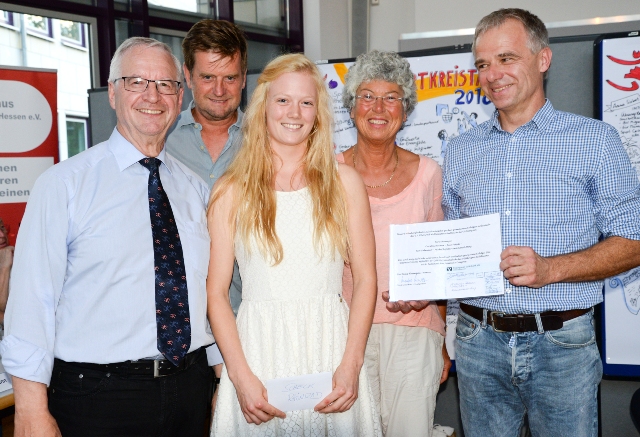 Der Sportkreisvorsitzende Manfred Schmidt (l.) ehrte die dreifache Weltmeisterin Kira Homeyer (Mitte). Darüber freuten sich auch der Vorsitzende des TSV Bleidenstadt Markus Jestädt (2.v.l.), die 2. Vorsitzende des SV Neuhof Sigrid Kleffmann-Meyer (2.v.r.) und Trainer Jürgen Bientzle (r.). Foto: MRM