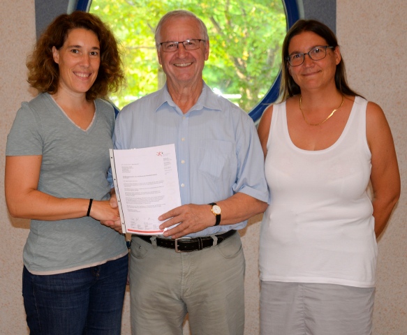 Der Sportkreisvorsitzende Manfred Schmidt (Mitte) und übergab den Bewilligungsbescheid an die Vorsitzende des TV Hahn Anke Loskant (l.) und Schatzmeisterin Bianca Ernst-Swatosch (r.). Foto: MRM