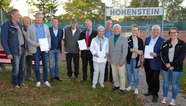 Rheingau-Taunus-Kreis/Hohenstein – (MRM) Der Vorsitzende des Sportkreises Rheingau-Taunus Manfred Schmidt und sein Stellvertreter Helmut Heisen überreichte im Rahmen einer kleinen Feierstunde im Tennisheim des TC Hohenstein an vier Sportvereine aus dem Bereich Untertaunus Förderbescheide des Landessportbundes Hessen (lsb h) in Höhe von knapp 4000 Euro.