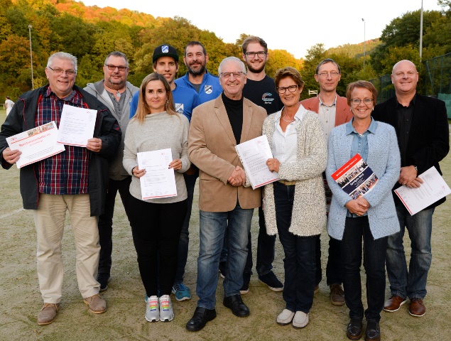 Der Sportkreisvorsitzende Manfred Schmidt (6.v.l.) und Jugendwart Dorian Massmig (dahinter) übergaben die Bewilligungsbescheide an (v.l.) Stefan Birka, Lutz Mohrmann (beide SV Wisper Lorch), Silvia Leder (TC GW Hallgarten), Julian Dahlen, Holger Büschenfeld (beide Wisper Lorch), Susanne Bartholomay (SV Espenscheid), Matthias Mecky (TG Mittelheim), Kirsten Michel-Klotz (SV Espenschied) und Andreas Scharf (TG Mittelheim). Foto: MRM