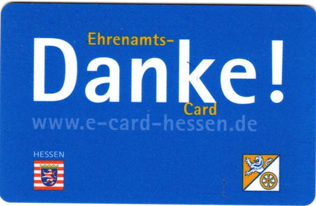 Die E-Card ist hessenweit gültig, d. h. die Inhaber einer E-Card erhalten nicht nur die Vergünstigungen ihres Landkreises, sondern alle Vergünstigungen in ganz Hessen! Mittlerweile sind 15.000 Menschen hessenweit im Besitz einer E-Card. Dies zeigt eindeutig, dass es in Hessen nicht nur viele Menschen gibt, die sich ehrenamtlich engagieren, sondern auch einige, die das Ehrenamt schätzen und mit ihren Angeboten unterstützen. Da der Katalog der Vergünstigungen ständig wächst, ist dieser ausschließlich auf der Seite www.ecard-hessen.de abrufbar. (Quelle: Rheingau-Taunus-Kreis)