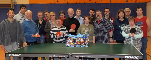 Hohenstein – (MRM) Die Teilnehmer der Tischtennis-AG in den Werkstätten für Behinderte Wiesbaden-Rheingau-Taunus (wfb) in Breithardt trugen ihr traditionelles vorweihnachtliches Tischtennisturnier aus. Der Vorsitzende des Sportkreises Rheingau-Taunus Manfred Schmidt und sein Stellvertreter Helmut Heisen überzeugten sich persönlich vom Leistungsstand der Teilnehmer und waren zudem begehrte Spielpartner.