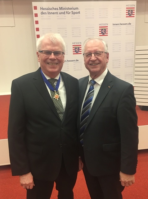 Werner Koch waren und sind vor allem die Förderung von Vereinen und Verbänden eine Herzensangelegenheit. Koch ist Vorstandsmitglied der Stiftung Sporthilfe Hessen und kümmert sich dort um talentierte Sportlerinnen und Sportler in den hessischen Vereinen, die auf dem Weg in den Spitzensport sind. Als Vizepräsident der Sportklinik Frankfurt kümmert er sich auch um die Gesundheit der Sportler. Werner Koch vertrete auf herausragende Weise die Interessen des Sports in und für unsere Gesellschaft“, erklärte der Ministerpräsident. Aus Altersgründen scheidet Koch zur neuen Legislaturperiode aus dem Staatsdienst aus. Seit letztem Jahr ist Koch auch zweiter Vorsitzender des Sportkreis Rheingau-Taunus. Manfred Schmidt war es daher ein besonderes Anliegen bei der Verleihung anwesend zu sein, Koch persönlich zu seiner Auszeichnung zu gratulieren und in den verdienten Ruhestand zu verabschieden. Nun habe er noch mehr Zeit für seine Tätigkeiten im Sportkreis bemerkte Schmidt lachend. Text: Michael Hoyer