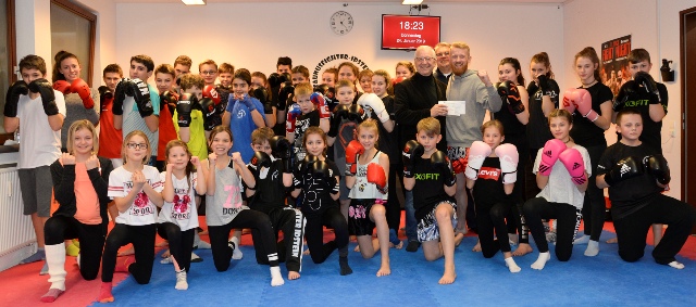 Sportkreisvorsitzender Manfred Schmidt übergibt einen Scheck an Liam Conway, 1. Vorsitzender und Cheftrainer der Taunusfighter, inmitten einer Trainingsgruppe Kinder und Jugendlicher Foto: Michael Reitz
