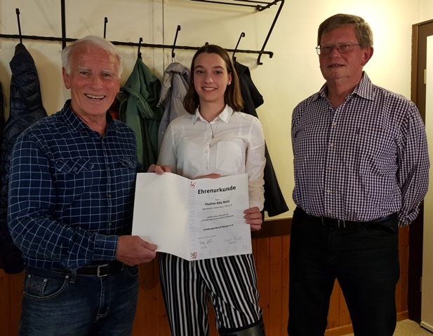 Beim SV Hohenstein konnten anlässlich der Jahreshauptversammlung zwei besonders aktive Mitglieder geehrt werden. Neben Markus Keil, der nicht anwesend sein konnte, stand Pauline Mehl im Mittelpunkt. Helmut Heisen, der 2. Vorsitzende des Sportkreis Rheingau-Taunus, überbrachte die Ehrenurkunde des Landessportbundes Hessen. Mit launigen Worten bedankte er sich herzlich bei Pauline, die neben ihren schulischen Aufgaben beachtenswerte sportliche Erfolge vorweisen kann und außerdem noch die Zeit findet, ehrenamtliche Arbeit zu leisten und die jüngeren Jahrgänge des Vereins trainiert. Ein solches Engagement kann sich jeder Verein nur wünschen. Der Vorsitzende des Sportkreises, Manfred Schmidt ließ seine herzlichen Glückwünsche ausrichten. Herzlich gratulierte auch der Vorsitzende Diethart Patzelt, der unter anderem dank Paulines Mitarbeit „seine“ Leichtathleten in guter Verfassung sieht. Text: Helmut Heisen