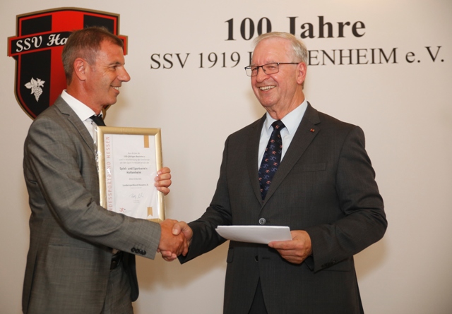 Sportkreisvorsitzender Manfred Schmidt freute sich die herzlichen Glückwünsche, zum stolzen Jubiläum des SSV 1919 Hattenheim, von dem Präsidenten des Landessportbundes Dr. Rolf Müller und die des Sportkreises Rheingau Taunus mit einem Dankeschön für die Einladung zur heutigen Feierstunde zu überbringen. Schmidt konnte nicht verhehlen, dass es auch schön sei, dass der Sport den Reigen der Grußworte eröffne.