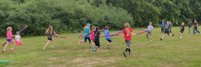 Am Donnerstag, unserem vierten Tag, lernten wir das Spiel Jugger kennen. Bei dieser Teamsportart geht es darum, dass der Läufer den Jugg (Spielball) so oft wie möglich in das gegnerische Mal (Tor) bringt. Die Spieler können dabei durch eine Berührung mit einem Pompfen (gepolstertes Sportgerät) zum Strafknien für eine bestimmte Zeit gezwungen werden. Ziel ist es den eigenen Läufer auf dem Weg zum gegnerischen Mal zu beschützen und den gegnerischen Läufer am Erreichen des eigenen Mals zu hindern. Nachdem dies zunächst in kleineren Gruppen geübt wurde spielten die größeren Gruppen gegeneinander. Den Nachmittag gestalteten wir mit einer Challenge. Dabei wurden Aufgaben, die von der kompletten Gruppe bewältigt werden mussten, gestellt. Die Aufgaben reichten vom Zöpfe flechten über 1000 Mal Seilhüpfen bis hin zum Holzsammeln für das Lagerfeuer am Abend. Vor dem Lagerfeuer grillten wir unser Abendessen und wurden von der Küche mit Salaten, Beilagen und Nachtisch versorgt. Mit dem gesammelten Holz ließen wir den letzten Abend am Lagerfeuer ausklingen und tauschten uns noch einmal über die vergangenen Tage aus, in denen wir viele Aktivitäten zusammen erlebt hatten.