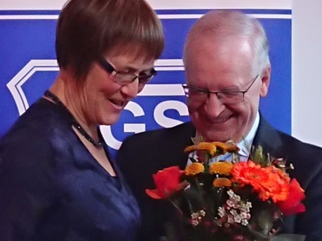 Gerda Kauzmann empfängt die bedeutungsvollen „Blumensträuße“ von Manfred Schmidt. Foto: Gerda Kauzmann