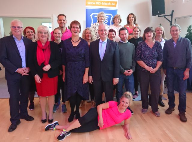 Stehend v.l. Werner Koch, Petra Müller-Klepper, Gerda Kauzmann, Manfred Schmidt, weitre Vorstandsmitglieder und Übungsleiter der TG Erbach. Foto: Gerda Kauzmann