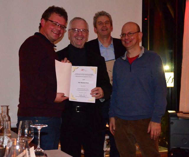 Sportkreisvorsitzender Manfred Schmidt freute sich für die Einladung zum Vereinsabend des Wassersportverein Geisenheim 1912 e.V.. Der Vereinsabend dient auch als würdiger Rahmen für Ehrungen und Danksagungen an verdiente ehrenamtliche Mitglieder. Manfred Schmidt freute sich Bastian Koch eine Urkunde des Sportkreises zu überreichen. Als Dank und in Anerkennung seiner Leistungen und Verdienste in 30 Jahren Vereinszugehörigkeit beim WSV. Schmidt wünschte dem Verein und seinen Mitgliedern weitehin viel Glück und wies nochmals darauf hin, daß der Sportkreis immer seinen Vereinen zur Seite steht. Text: Michael Hoyer