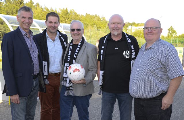 v.l. Landrat Frank Kilian, Bürgermeister Sandro Zehner, Sportkreisvorsitzender Manfred Schmidt, SVN-Vorsitzende Dieter Hannes, Kreisfußballwart Erich Herbst. Foto: Michael Reitz