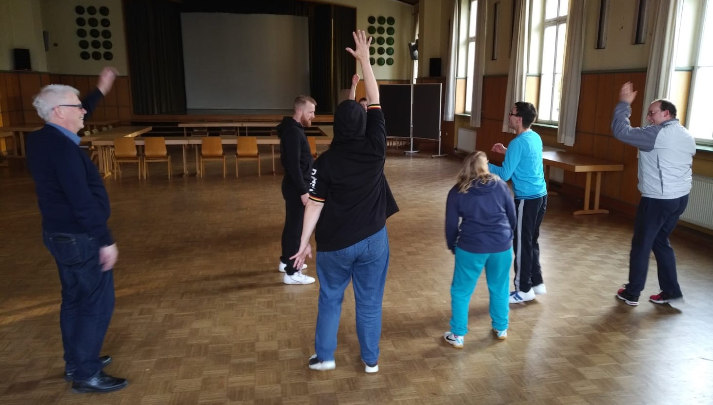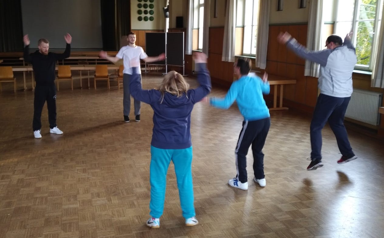 v.l. Werner Koch bei Übungen mit Trainer, Bewohnern und Erziehern . Foto: Manfred Schmidt