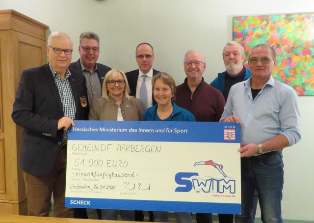 Mit dem bundesweit einmaligen Schwimmbadinvestitionsprogramm SWIM fördert die Landesregierung hessenweit Frei- und Hallenbäder. 50 Millionen Euro stehen von 2019 bis 2023 für Sanierungs- und Modernisierungsmaßnehmen zur Verfügung. Vertreter der Gemeinde Aarbergen konnten sich anlässlich einer SWIM-Bescheidübergabe durch Innenminister Peter Beuth über 51.000 Euro für die Sanierung der Umkleideräume und sanitären Anlagen des Passavant Waldschwimmbads in Aarbergen-Michelbach freuen.