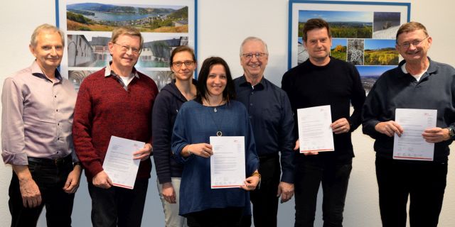 Der Sportkreisvorsitzende Manfred Schmidt (3.v.r.) übergab die vier Förderungsbescheide des lsb h an (v.l.) Jürgen Bosse, Dietmar Patzelt (beide SV Hohenstein), Marina Mesenholl, Pamela Stelzer (beide TV Hattenheim), Markus Jestaedt (TSV Bleidenstadt) und Volkmar Schrecke (TG Niedernhausen). Foto: Michael Reitz
