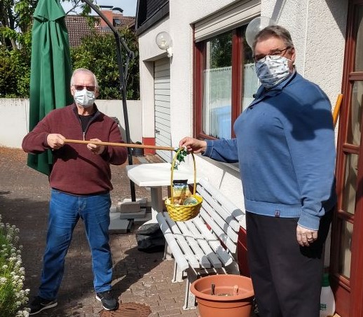 Sportkreisvorsitzender Manfred Schmidt ließ es sich nicht nehmen, trotz der Corona-Krise, Geburtstagswünsche an sein Vorstandsmitglied Michael Hoyer persönlich zu überreichen. Alles natürlich unter strenger Beachtung der geltenden Auflagen und Sicherheitsabständen. Hoyer ist derzeit stündlich online für den Sportkreis aktiv um die Sportkreishomepage und die Vereine immer aktuell auf dem Laufenden zu halten. Völlig überraschend kam der Besuch des Sportkreisvorsitzenden für Hoyer. Mit einem umfunktionierten Dachlukenöffner übergab Schmidt, vor der Haustür, ein paar Leckereien als Geburtstagspräsent. Schmidt und Hoyer waren erfreut sich nach langer Zeit wieder einmal persönlich zu sehen und zu hören. Auch solch nette Gesten zeigen wie wichtig soziale Kontakte für unser Zusammenleben sind. Beide hoffen, daß sich die Lage baldmöglichst entspannt und die Vereine Ihre wichtigen sozialen Funktionen und Aufgaben langsam wieder aufnehmen können. Nach einem kurzen Gespräch ging es dann für Beide wieder an Ihre ehrenamtliche Tätigkeit, die Vereine Ihres Kreises, wo immer möglich zu unterstützen. Text: Michael Hoyer