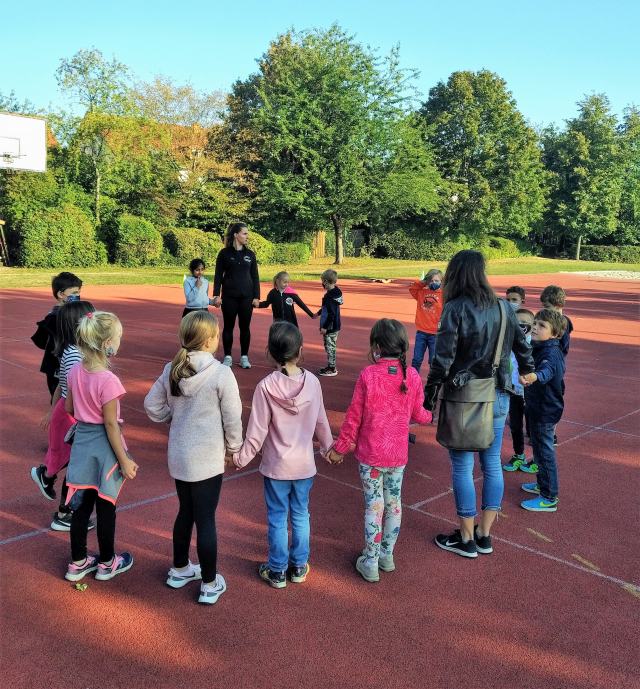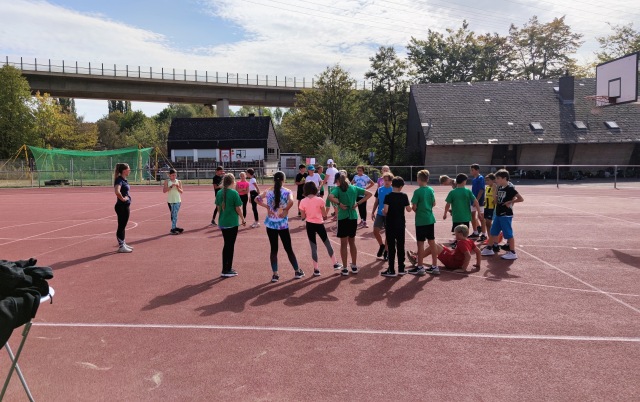 v.l. Lena Herke, Jugendwartin des Sportkreises bei einer Besprechung im großen Kreis mit den Schülern. Foto: Dorian Massmig