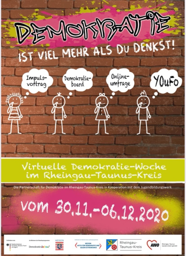 hiermit möchten wir die Virtuelle Demokratie-Woche vom 30.11. – 06.12. zum Thema Jugendpartizipation und Ehrenamtliches Engagement der Partnerschaft für Demokratie im Rheingau-Taunus-Kreis in Kooperation mit dem Jugendbildungswerk ankündigen.