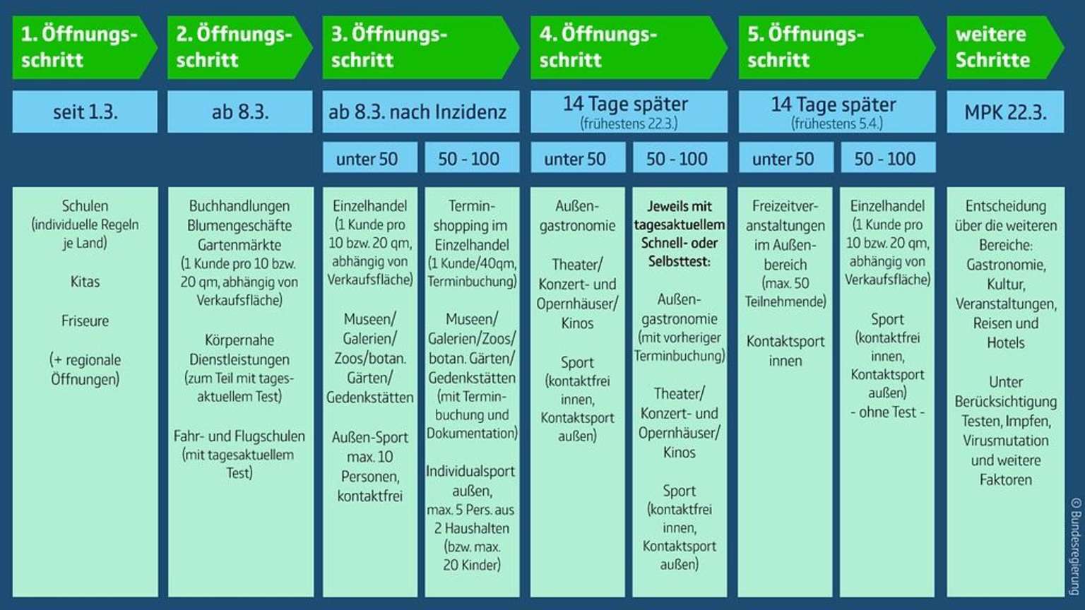 - Notbremse: Sie greift, wenn die Sieben-Tage-Inzidenz landesweit über 100 steigt. Dann treten die aktuellen, noch bis Sonntag geltenden strengeren Regeln wieder in Kraft.