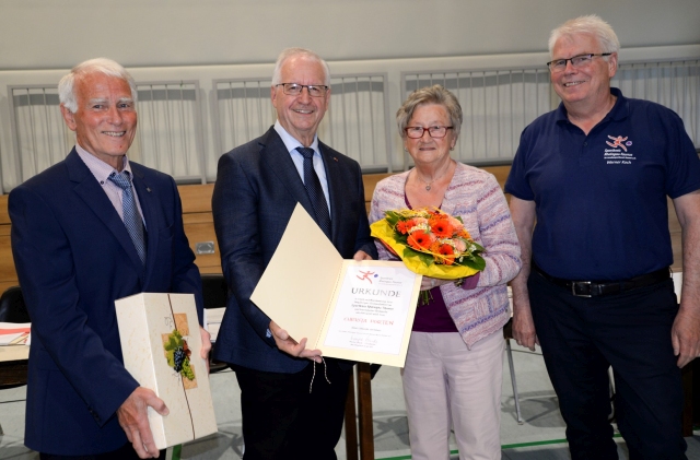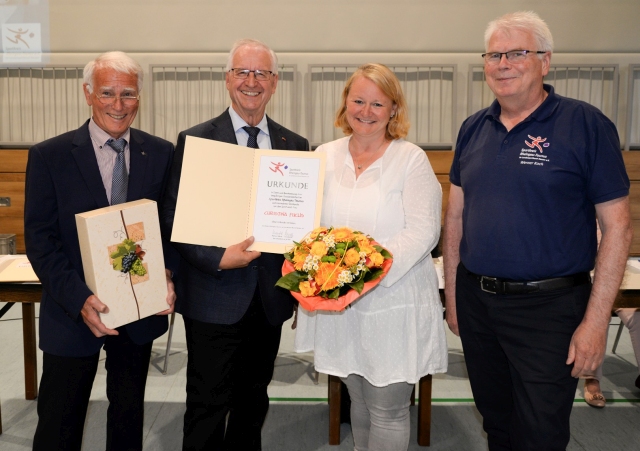 In seiner kurzen Laudatio betonte Schmidt, dass Christina Fuchs dem Sportkreisvorstand seit 1999 angehört habe. Sie habe währenddessen nicht nur zuverlässig das Protokoll geführt, sondern auch mit hoher Kompetenz das Projekt „Bewegen macht Spaß“ betreut. „Sie war auch meine ganz persönliche Stütze, wenn ich wieder mal zu schnell gerannt bin“, fügte schmunzelnd an. Er dankte ihr herzlich für die freundschaftliche Zusammenarbeit. Zur „Überwindung des Trennungschmerzes“ überreichte er ihr ein Präsent, einen Blumenstrauß und eine Ehrenurkunde.
