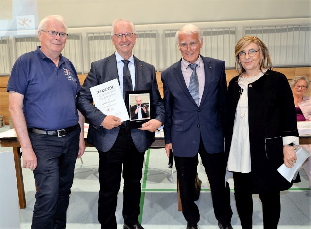 Der scheidende Sportkreisvorsitzende Manfred Schmidt (2.v.l.) wurde zum Ehrenvorsitzenden ernannt. Dazu gratulierten seine Bisherigen Stellvertreter Werner Koch (l.) und Helmut Heisen (2.v.r.) sowie Vorstandsmitglied Uschi Ferry. Foto: MRM
