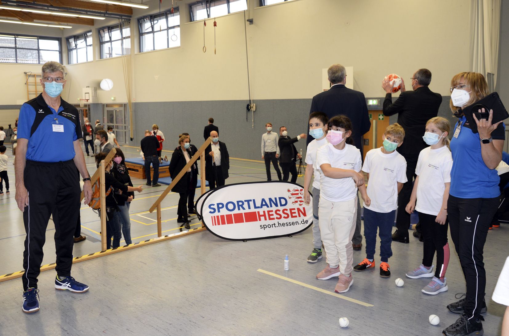 Der Sportkreisvorsitzende Markus Jestaedt (hinten Mitte) und Sportminister Peter Beuth (r. daneben) verfolgten hautnah die einzelnen Übungen beim „Hessischen Bewegungscheck“. Foto: MRM