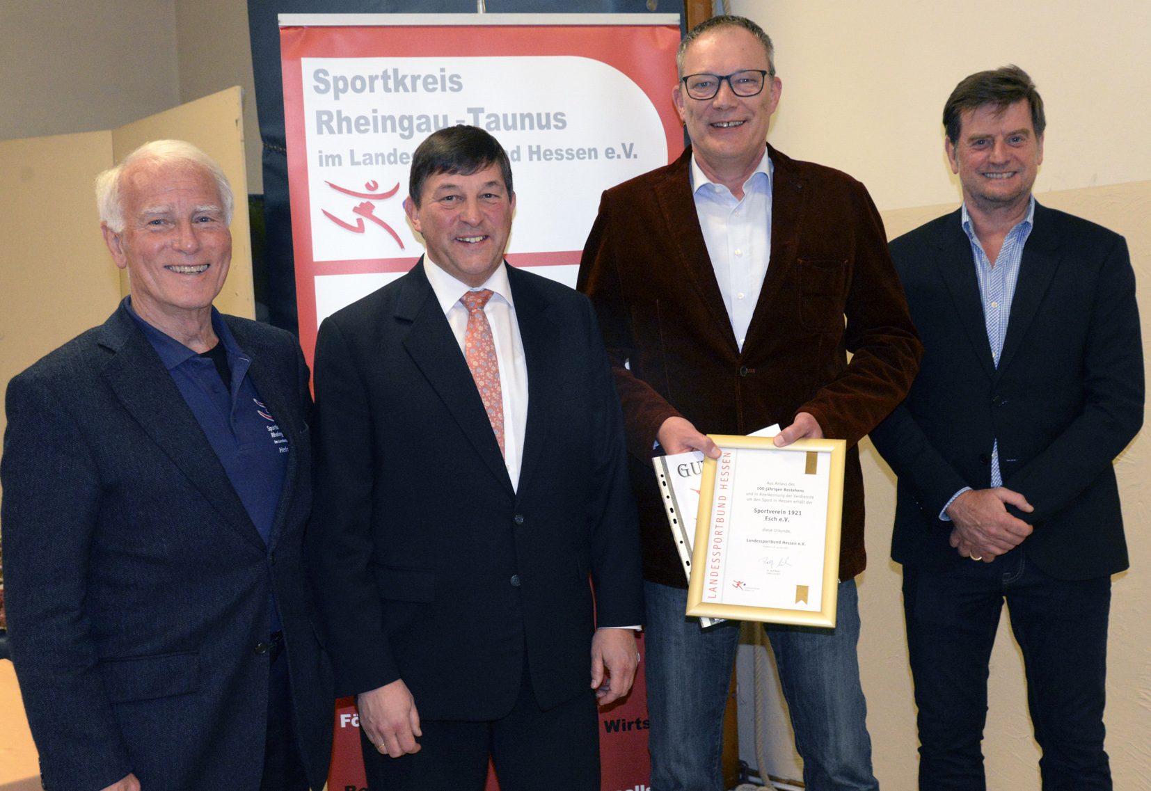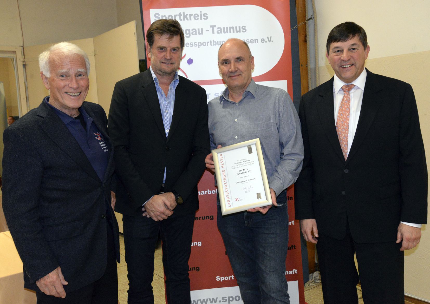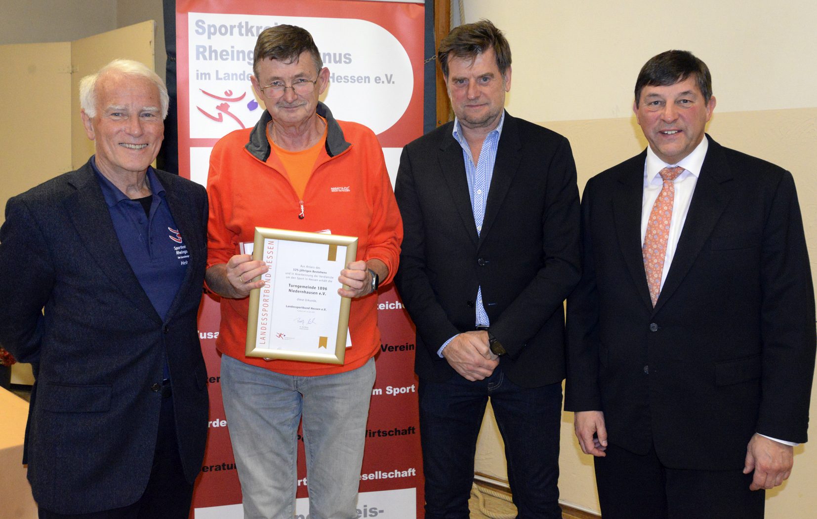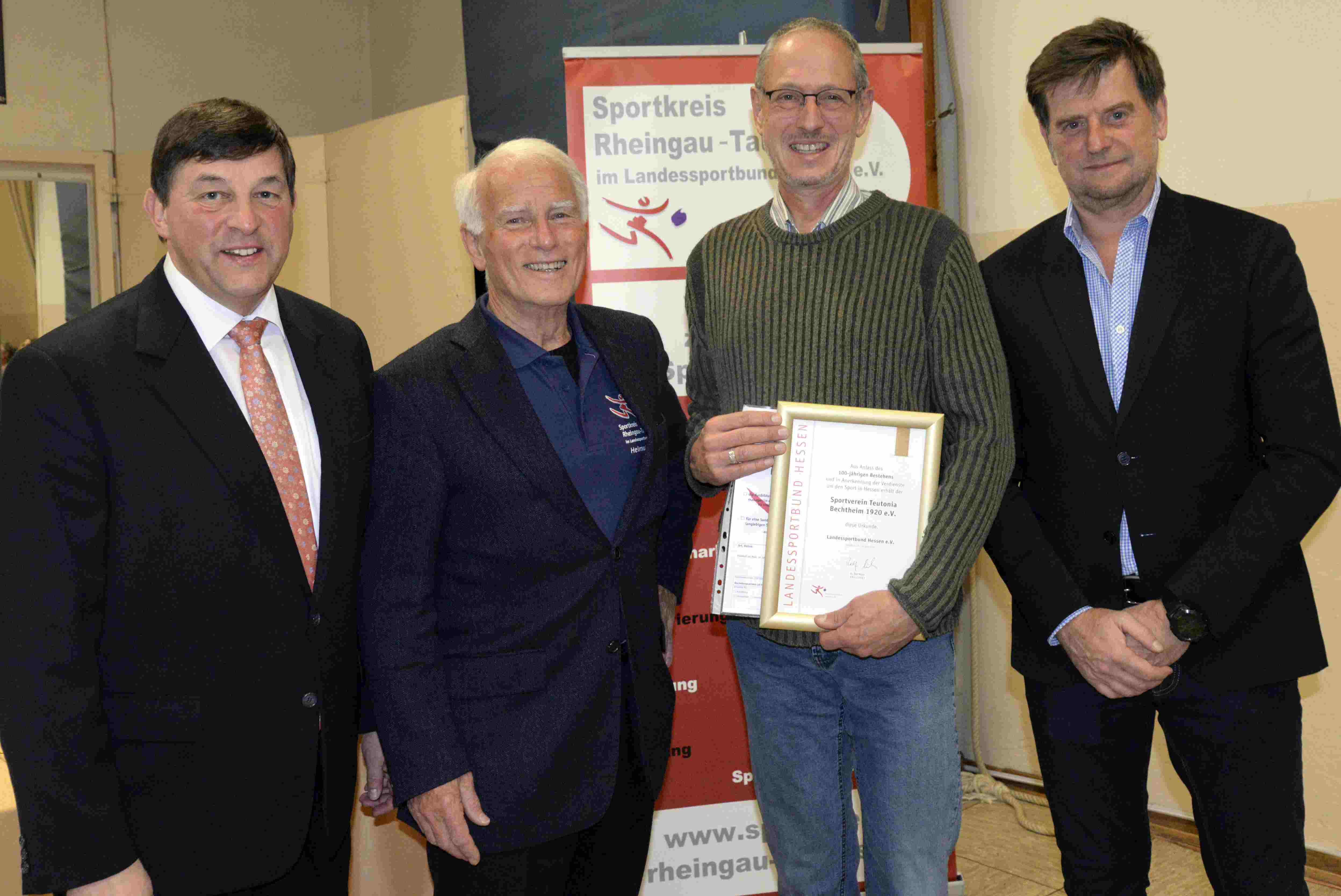 Zum 125-jährigen Bestehen wurde die TG Niedernhausen mit einer Urkunde und einer Zuwendung bedacht, die der Vorsitzende Volkmar Schrecke (2.v.l.) stolz präsentiert. Dazu gratulierten der Sportkreisvorsitzende Markus Jestaedt (2.v.r.) und seine Stellvertreter Dirk Guentherodt (r.) und Helmut Heisen (l.). Foto: MRM