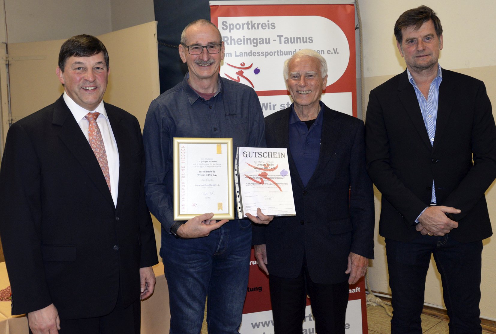 Auf eine 175-jährige Vereinsgeschichte kann die TG Winkel 1846 zurückblicken. Dafür gab es natürlicheine Ehrenurkunde und eine Zuwendung vom lsbh. Klaus Seifert vom Vorstandteam (2.v.l.) nahm beides aus der Hand des Sportkreisvorsitzenden Markus Jestaedt (r.) entgegen. Auch seine beiden Stellvertreter Dirk Guentherodt (l.) und Helmut Heisen (2.v.r.) gratulierten. Foto: MRM