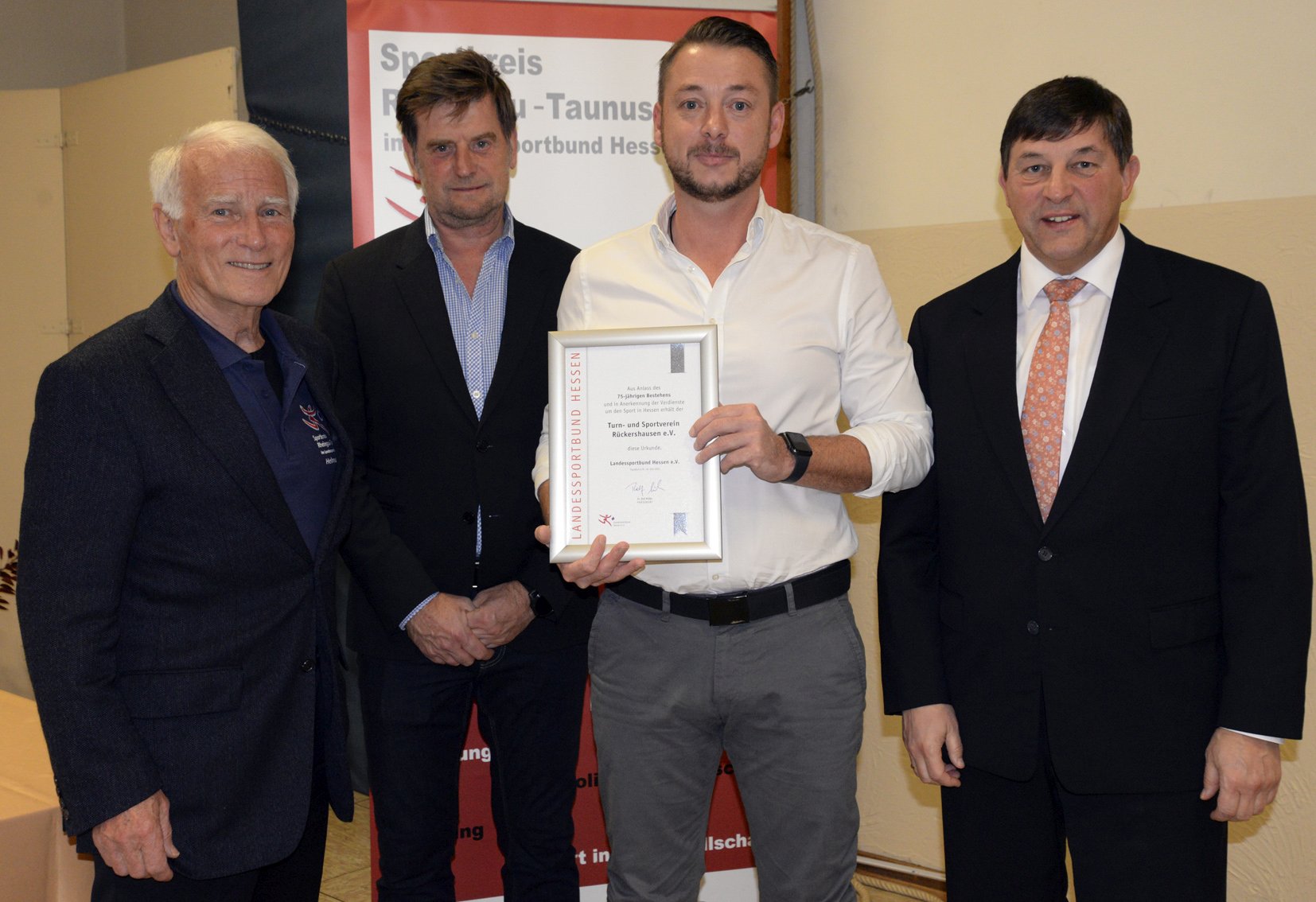 Die Urkunde des lsb h für den TuS Rückershausen erhielt der 1. Vorsitzende Alexander Diels (2.v.r.) vom Sportkreisvorsitzenden Markus Jestaedt (2.v.l.) sowie seinen beiden Stellvertretern Dirk Guentherodt (r.) und Helmut Heisen (l.). Foto: MRM