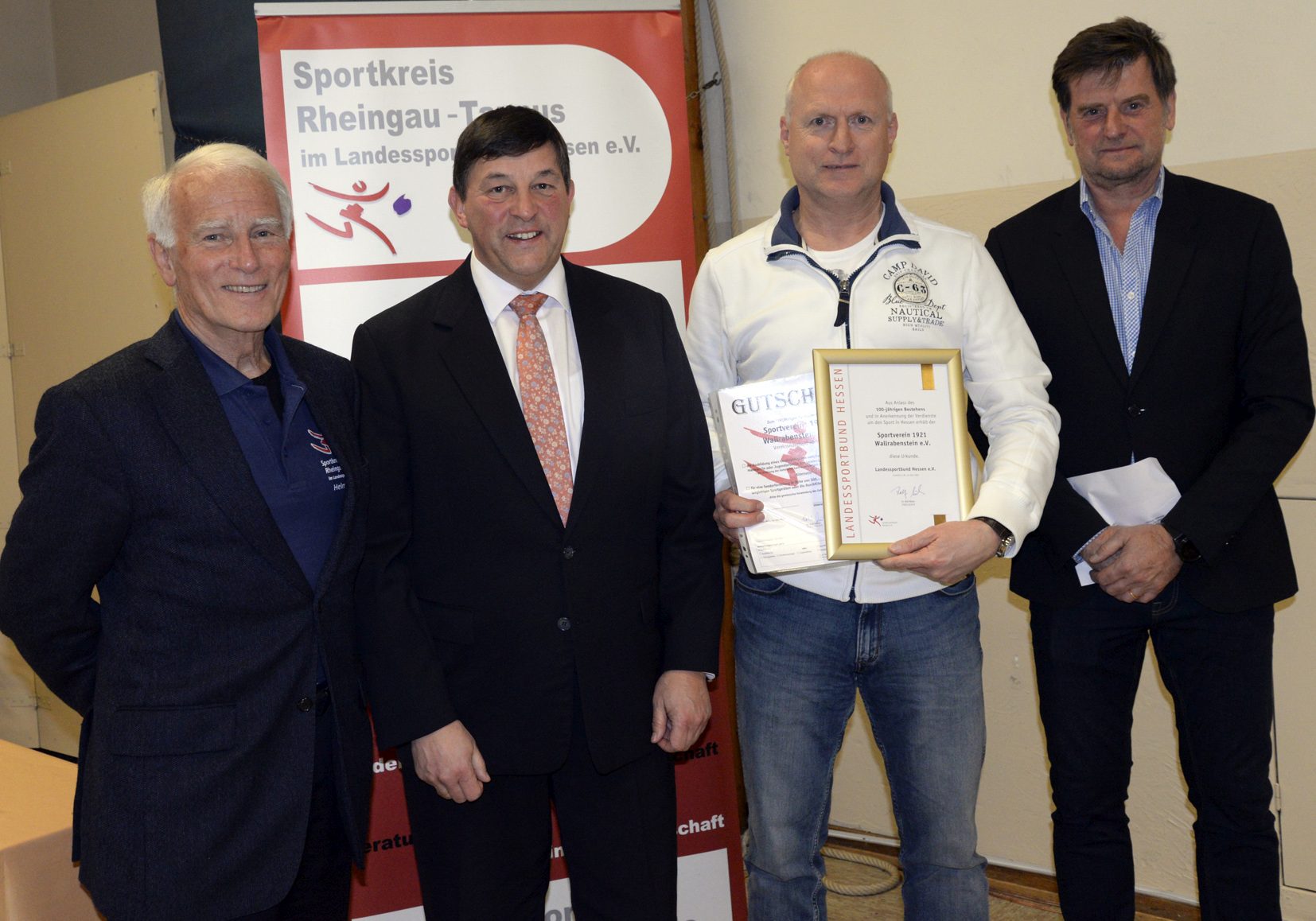 Dirk Hünerbein, Mitglied des Vorstandteams des SV 1921 Wallrabenstein (2.v.r.) nahm die Urkunde und eine Zuwendung vom Sportkreisvorsitzenden Markus Jestaedt (r.) entgegen. Mit im Bild Jestaedts Stellvertreter Dirk Guentherodt (2.v.l.) und Helmut Heisen (l.). Foto: MRM