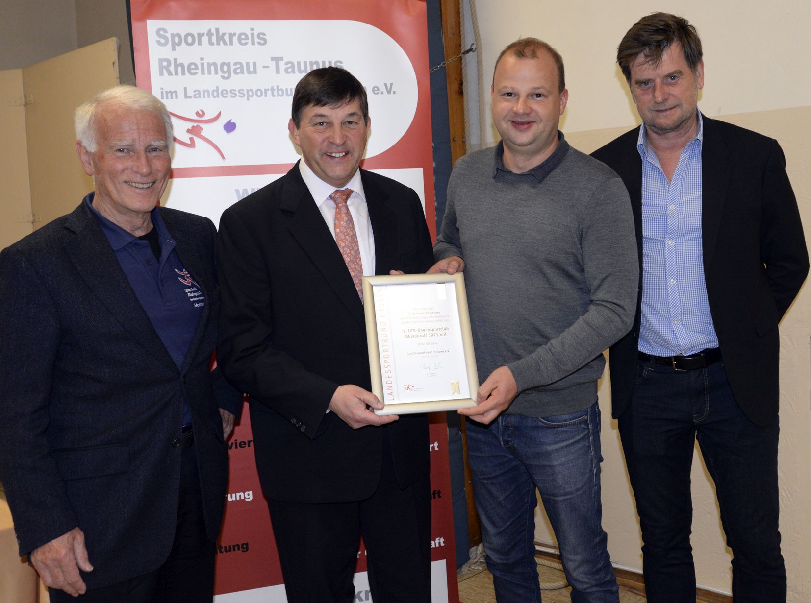 Der Vorsitzende des SV 1. UTK-Bogensportclubs Oberauroff Christopher Görgen (2.v.r.) freute sich über die Auszeichnung, zu der der Sportkreisvorsitzende Markus Jestaedt (r.) und seine beiden Stellvertreter Dirk Guentherodt (2.v.l.) und Helmut Heisen gratulierten. Foto: MRM