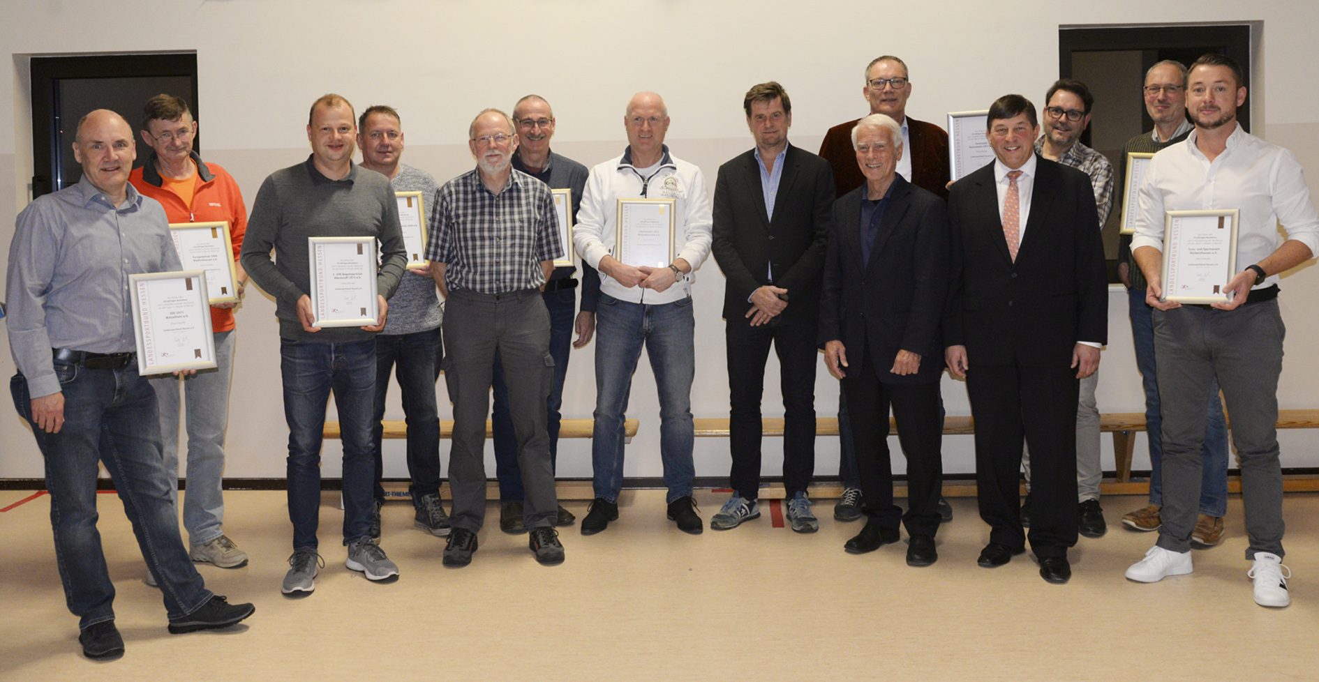 Der Sportkreisvorsitzende Markus Jestaedt (7.v.r.) und seine Stellvertreter Dirk Guentherodt (4.v.r.) und Helmut Heisen (5.v.r.) stellten sich nach der Feierstunde im Vereinsheim der TG Niedernhausen gemeinsam mit den Vereinsvertretern zum Gruppenbild. Foto: MRM