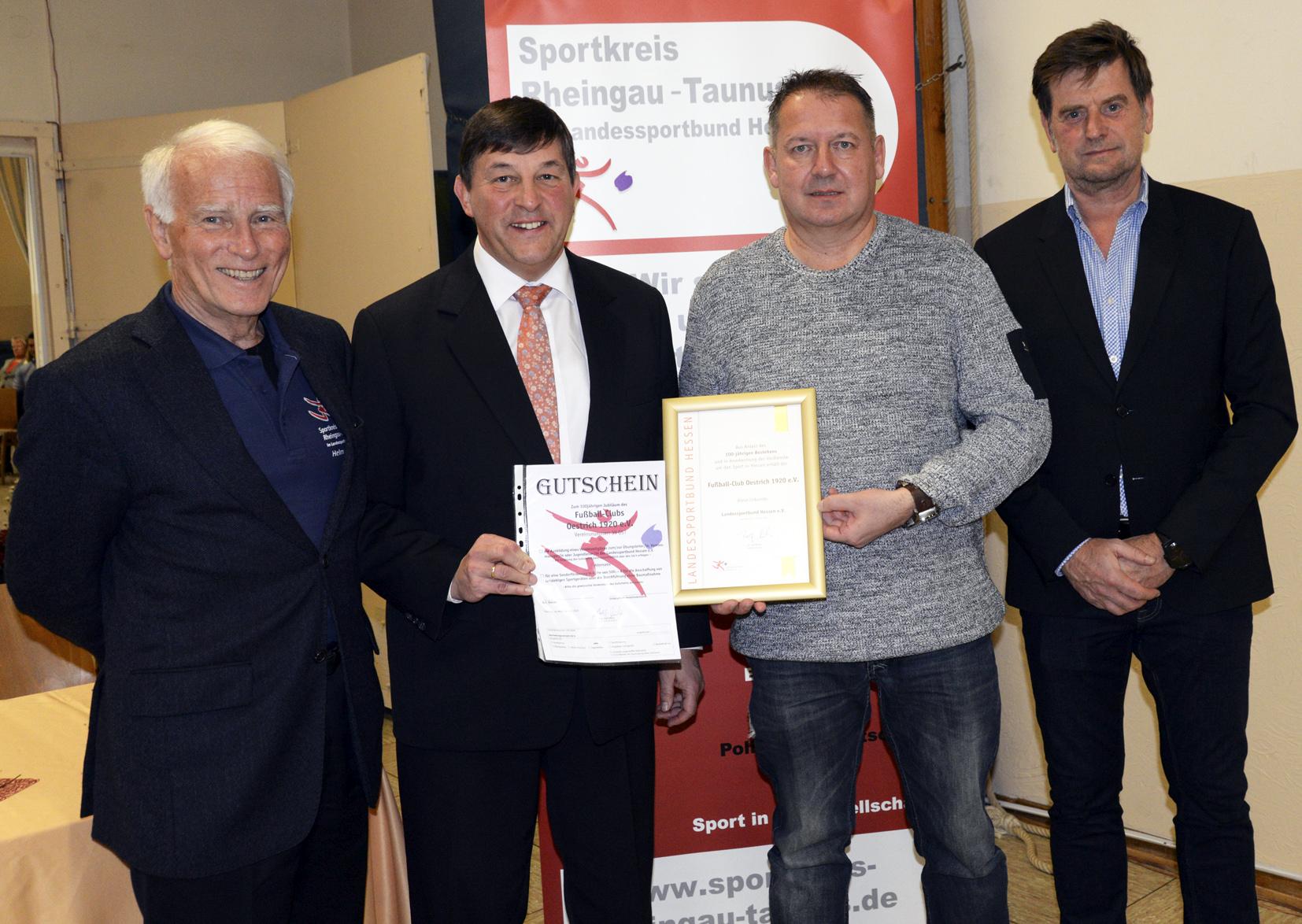 Urkunde und Zuwendung für den FC Oestrich nahm der 1. Vorsitzende Matthias Haas (2.v.r.) in Empfang. Beides wurde vom Sportkreisvorsitzenden Markus Jestaedt (r.) überreicht. Mit im Bild Jestaedts Stellvertreter Dirk Guentherodt (2.v.l.) und Helmut Heisen (l.). Foto: MRM