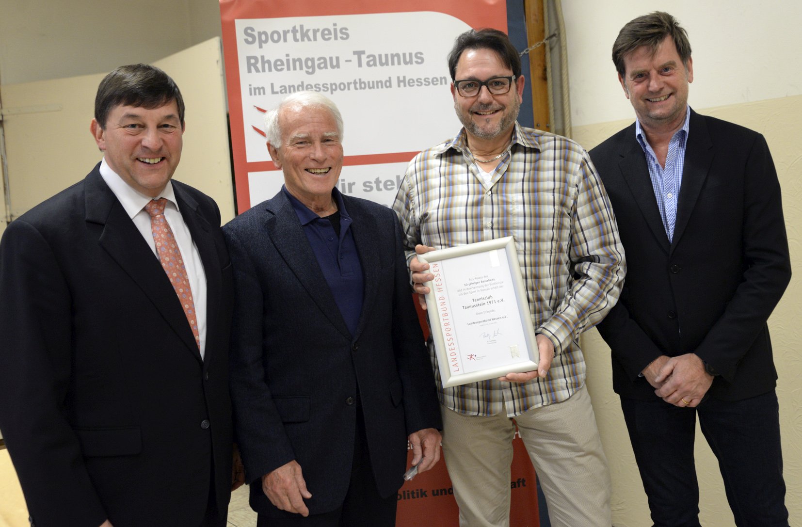 Der Vorsitzende des TC Taunusstein 1971 Stephan Krieger (2.v.r.) nahm die Urkunde vom Sportkreisvorsitzenden Markus Jestaedt (r.) entgegen. Mit im Bild Jestaedts Stellvertreter Dirk Guentherodt (l.) und Helmut Heisen (2.v.l.). Foto: MRM