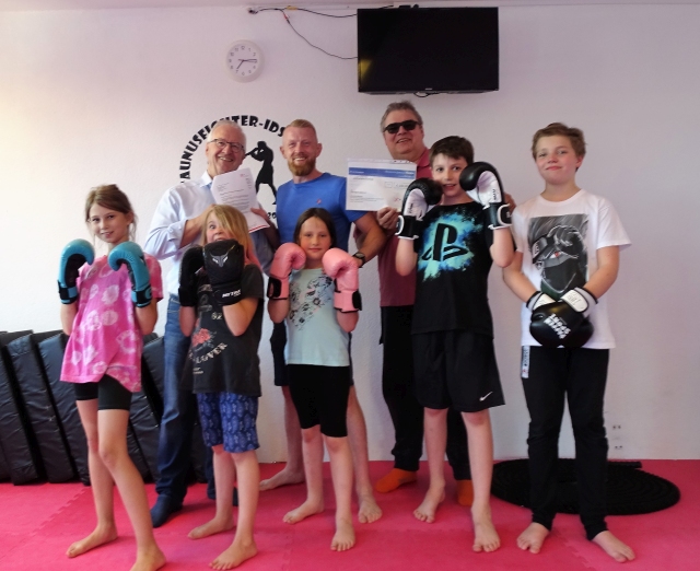 Beim einem Trainingsabend der Taunusfighter Idstein e.V. übergaben Manfred Schmidt, Ehrenvositzender des Sportkreis Rheingau-Taunus und Michael Hoyer, Referent für Öffentlichkeitsarbeit im Sportkreisvorstand, im Kreis der trainierenden Jugendlichen, einen Förderbescheid des Landessportbund Hessen an Liam Conway dem Vorsitzenden der Taunusfighter.
