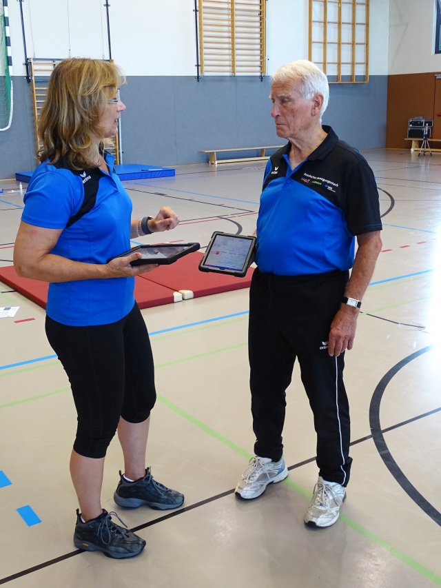 Stephanie Schweiger (Schriftführerin im Sportkreis und Sportabzeichenprüferin) im Fachgespräch mit Helmut Heisen (2. Vors. und Sportabzeichenprüfer). Foto: Michael Hoyer
