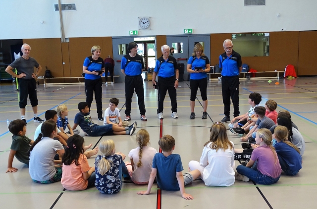 Helmut Heisen, 2. Vorsitzender des Sportkreis Rheingau-Taunus, führte mit seinem Team von Helfer*innen, fast alle mit sportpädagogischem Hintergrund, den Bewegungscheck der 3. Grundschulklassen, der Taubenbergschule durch.