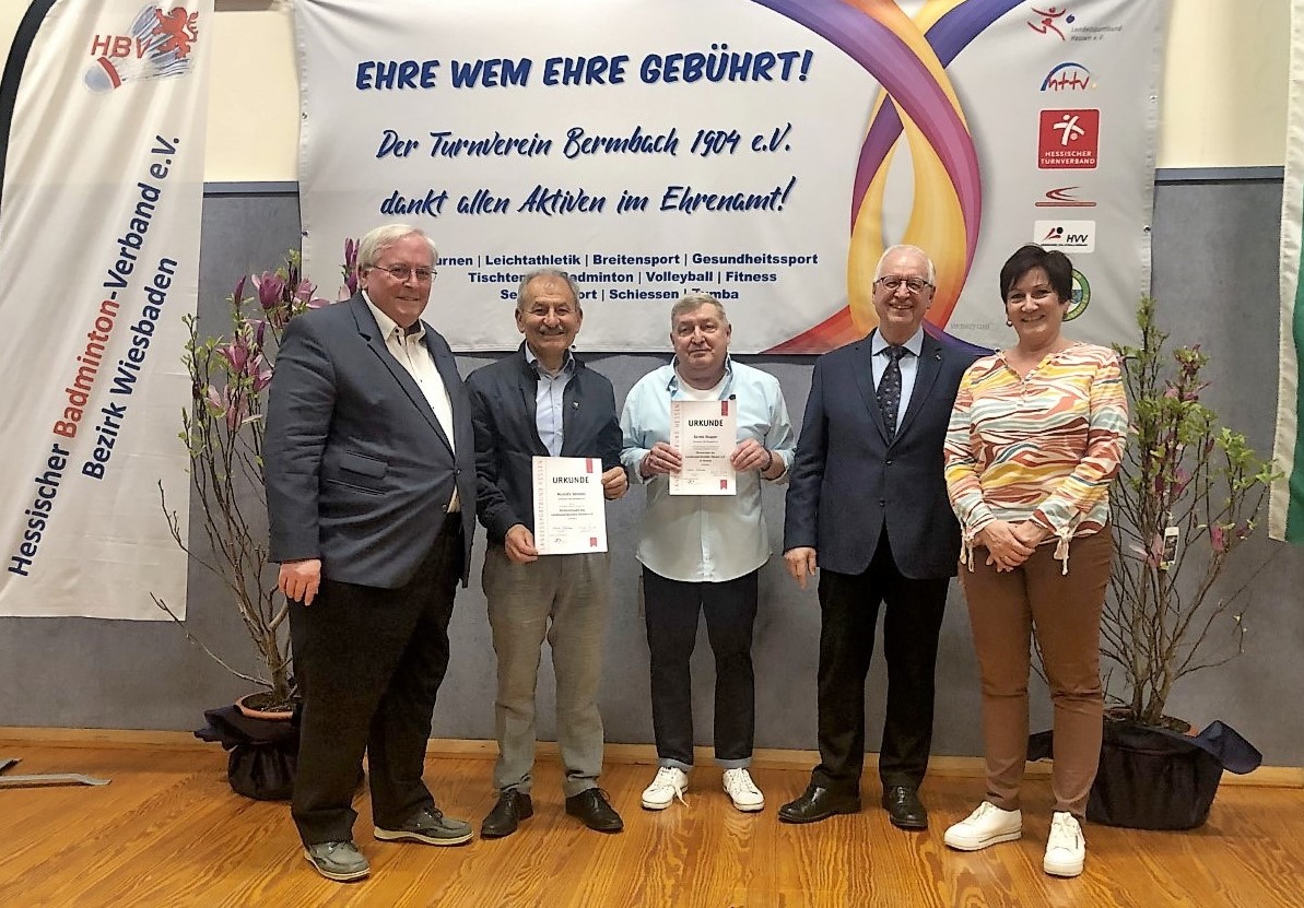 Der Ehrenvorsitzende des Sportkreises Rheingau-Taunus, Manfred Schmidt, überreichte im Namen des Landessportbundes Hessen insgesamt 2 Ehrungen. Schmidt kam in Vertretung des Vorsitzenden Markus Jestaedt der aufgrund eines anderen Sportkreistermins verhindert war und überbrachte dessen Grüße, an den TV 1904 Bermbach und die Ehrenden.