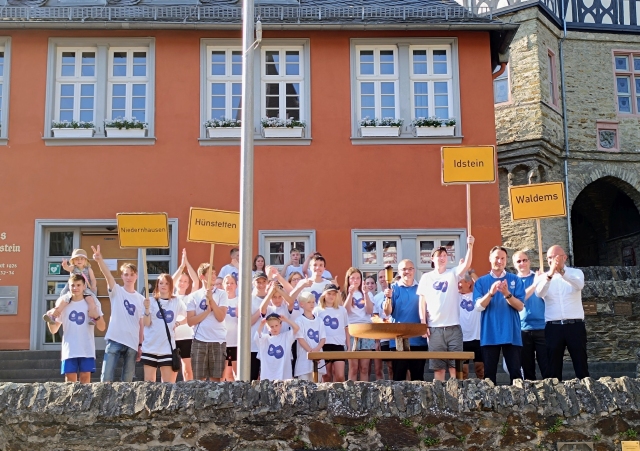 Zum Ende der Veranstaltung wurde dann als weiterer Höhepunkt ein symbolischer Fackellauf durchgeführt. Start und Ziel war der Vorplatz des Idsteiner Rathauses. Vertreter des „Idsteiner Landes“, der Gemeinden, Waldems-Esch, Niedernhausen, Hünstetten und Idstein beteiligten sich. Jede Gemeinde absolvierte mit seinen Läufern, die überwiegend Kinder und Jugendliche waren, mit und ohne Beeinträchtigung, einen Rundkurs durch die Idsteiner Altstadt. Jeder Gruppe voran ein Läufer*in mit der „Olympischen Fackel und Läufer*in mit dem symbolischen Ortsschild. Nach jeder Runde und Gemeinde wurde die Fackel auf dem Rathausplatz an die nächste Läufergruppe übergeben. Sportkreisvorsitzender Markus Jestaedt moderierte schwungvoll und souverän die Läufe, zum Vergnügen der anwesenden Besucher und Gäste der umliegenden Lokale. Als Abschluß und als Höhepunkt der Festlichkeiten, hatten die anwesenden Bürgermeister auch eine verantwortungsvolle Aufgabe zu erfüllen. Unter der Anleitung von Jestaedt entzündeten die Bürgemeister Joachim Reimann (Niedernhausen), Jan Kraus (Hünstetten), Markus Hies (Waldems-Esch) und Christian Herfurth (Idstein), symbolisch das Olympische Feuer der Special Olympics (Berlin).