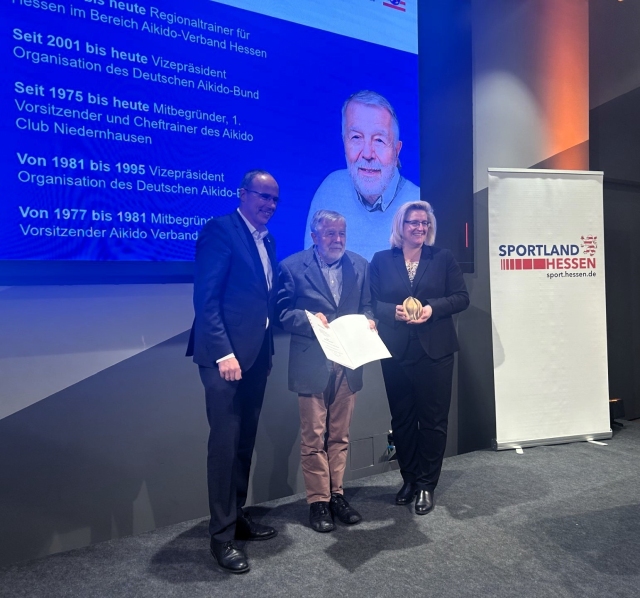 Manfred Jennewein, der seit über 40 Jahren Vorsitzender des Aikido Club Niederhausen ist, erhielt die Sportplakette in der Kategorie „Ehrenamt“ für sein unermüdliches Engagement für den Aikidosport. Der 84-Jährige, der wenige Tage zuvor vom Vorsitzenden des Sportkreises Rheingau-Taunus, Markus Jestaedt, mit der goldenen Ehrennadel des Landessportbundes Hessen ausgezeichnet wurde, war auch auf hessischer und nationaler Ebene ein prägender Funktionär in den Aikidoverbänden.