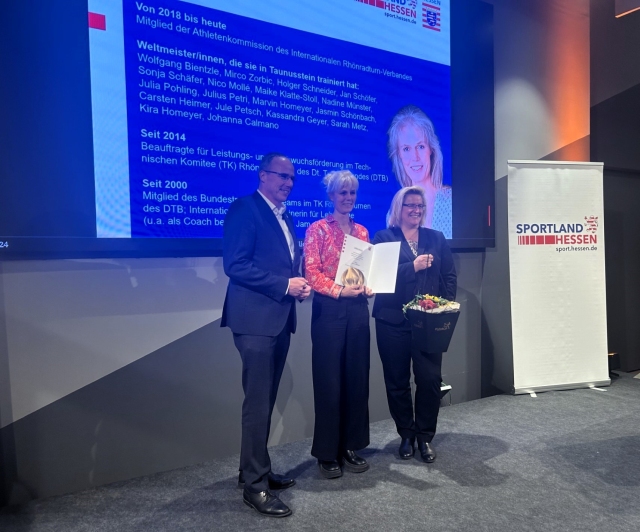 In der Kategorie „erfolgreiche Trainer/innen“ wurde Katja Homeyer für ihre Engagement im Rhönrad geehrt. Die Bundestrainerin im Rhönrad, unter deren Regie 18 Turner und Turnerinnen beim TSV Taunusstein-Bleidenstadt insgesamt 18 WM-Titel holten, ist seit über 10 Jahren zusammen mit ihrem Mann Jürgen Bientzle der Garant und Motor dafür, dass in Taunusstein Weltklasse Rhönrad geturnt wird.
