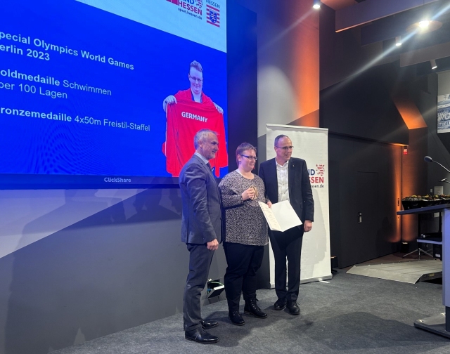 Für ihre herausragende Leistung bei den Special Olympics der World Games in Berlin erhielt Sabrina Blasius aus den Händen vom hessischen Innenminister Peter Beuth die Sportplakette in der Kategorie „erfolgreiche Athleten/innen. Die Schwimmerin des St. Vincenzstift aus Aulhausen bei Rüdesheim gewann in Berlin die Goldmedaille über 100 m Lagen, obwohl sie durch die Sperrung des Rheingau Bades kaum Gelegenheit zum Training hatte.