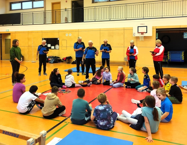 Kinder der Astrid-Lindgren-Schule und das Prüferteam bei der Einstimmung auf die gleich folgenden Aufgaben. Foto: Manfred Schmidt, Sportkreis