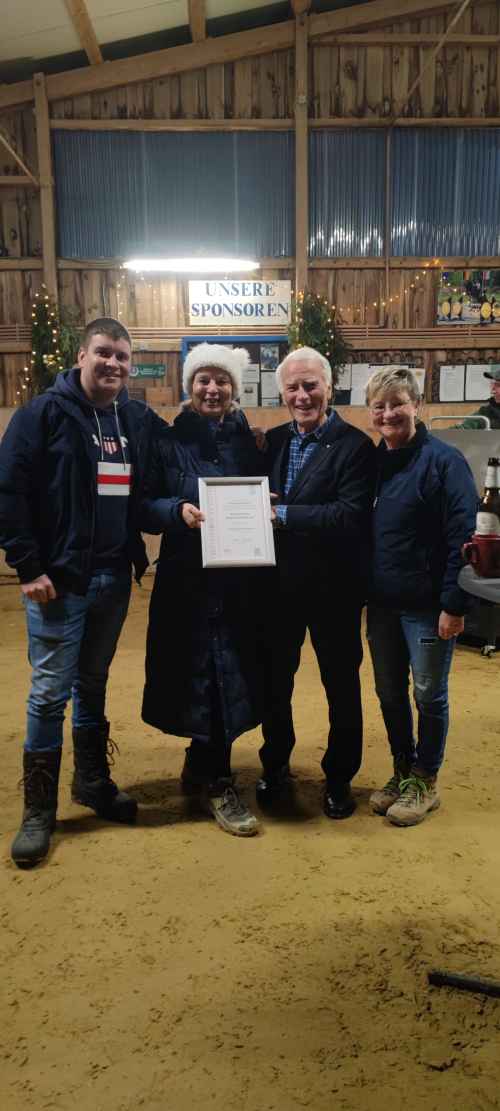 Schließlich überreichte Helmut Heisen dem 1. Vorsitzenden Philipp Meckel im Beisein der 2. Vorsitzenden Claudia und der Schriftführerin Anke Meckel die Urkunde des Landessportbundes und richtete die Grüße der Präsidentin Juliane Kuhlmann und des 1. Vorsitzenden des Sportkreises aus. Alle wünschen dem Verein eine gute Zukunft und verletzungsfreien Sport für Mensch und Tier.