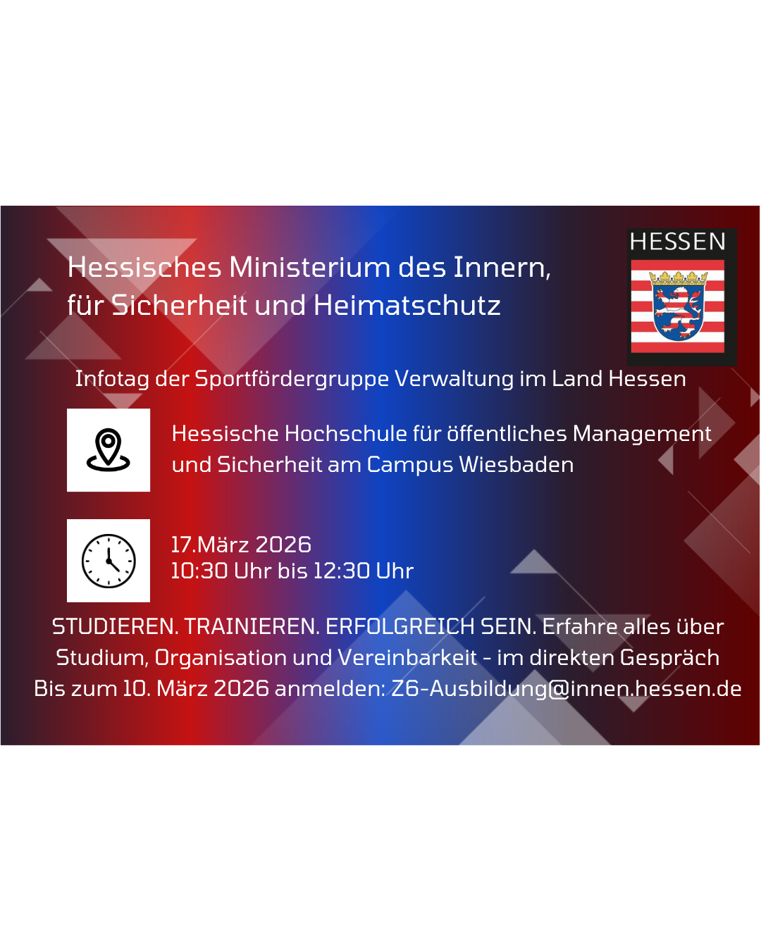 Das Hessisches Ministerium des Innern, für Sicherheit und Heimatschutz läd Leistungssportlerinnen und Leistungssportler herzlich ein, sich über die Inhalte und beruflichen Perspektiven dieses dualen Studiums zu informieren. Anmeldeschluss ist der 10. März 2026. Die Veranstaltung findet ab fünf Anmeldungen statt.